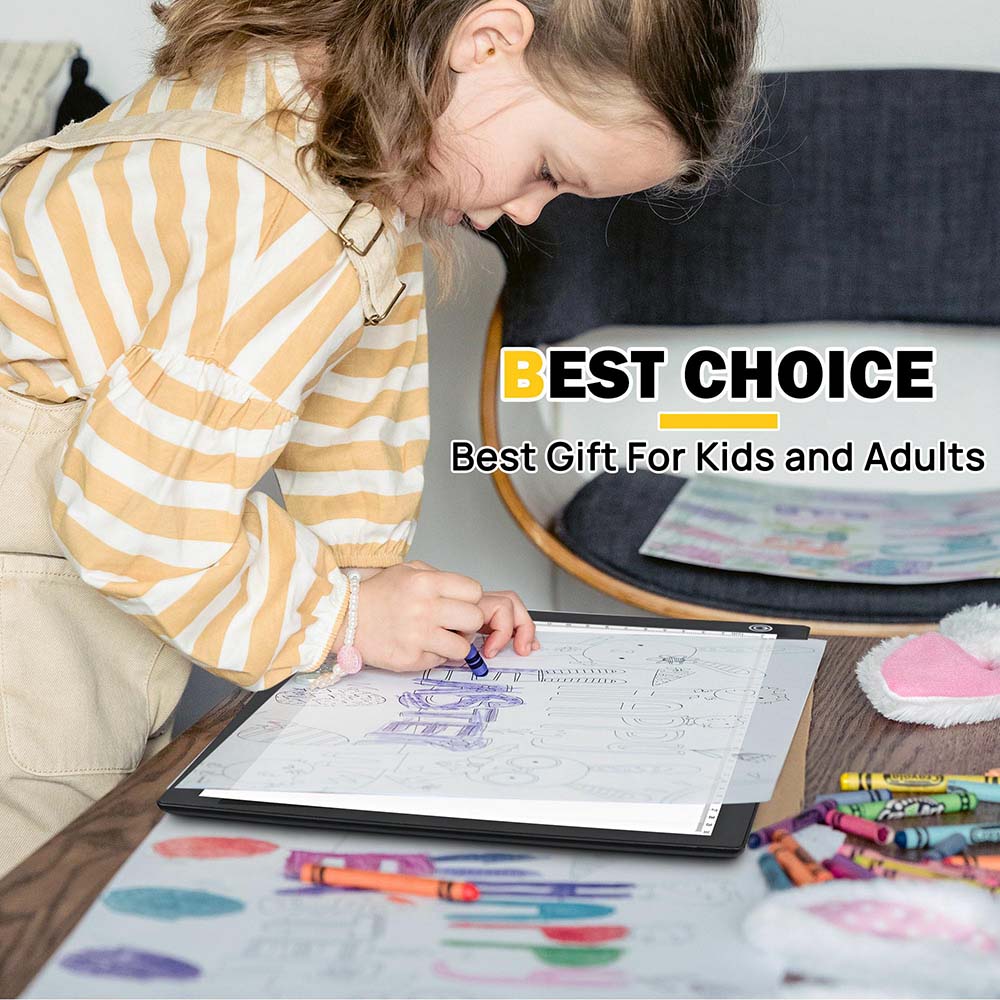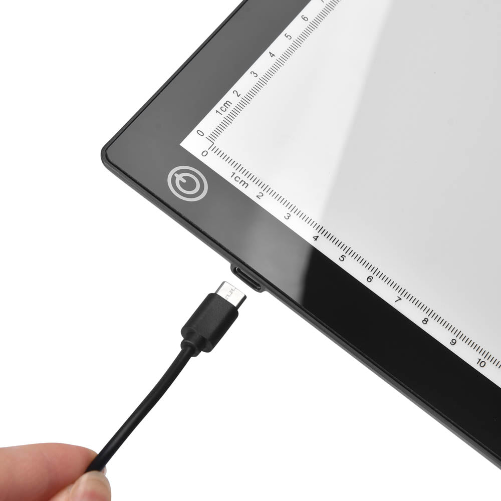 14 inch A4 LED Tracing Light Box with paper. It features adjustable brightness, super slim light board, eye-protective technology which is good for both professional artists or amateurs. It is used for tracing cartoons, stencils, tattoos, drawings, arts and crafts. Comes with 4 magnets help fixing paper at any position.