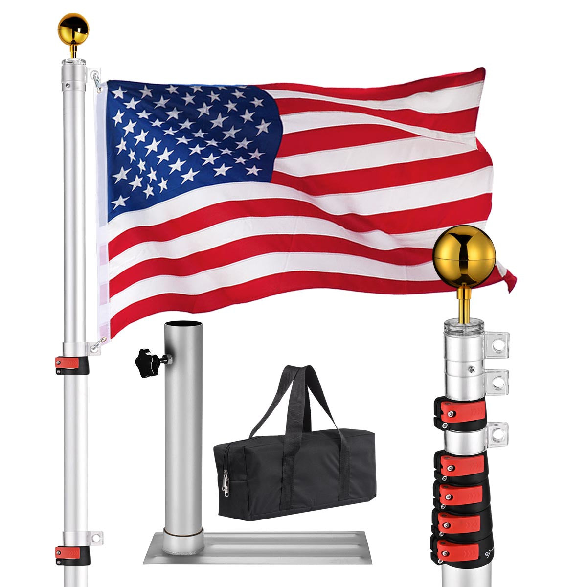 Kit includes Collapsible Flagpole + US Flag + Gold Ball Finial + Tire Stand