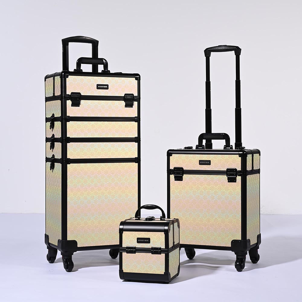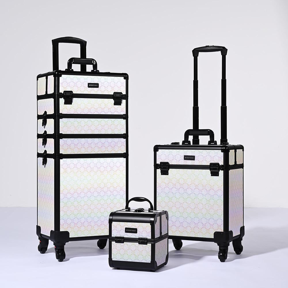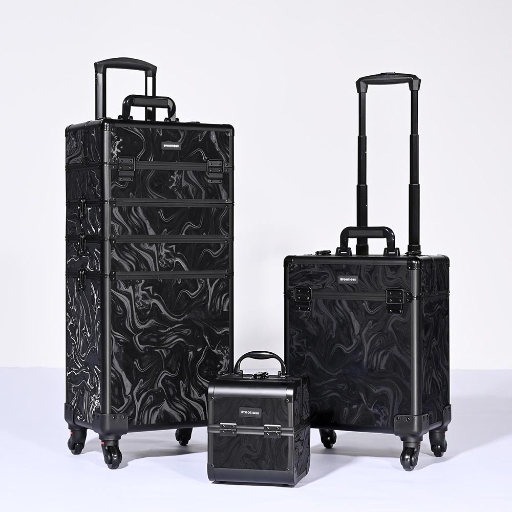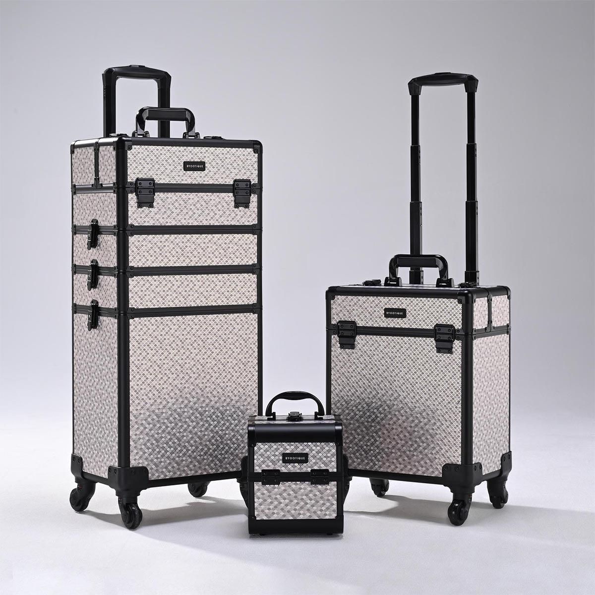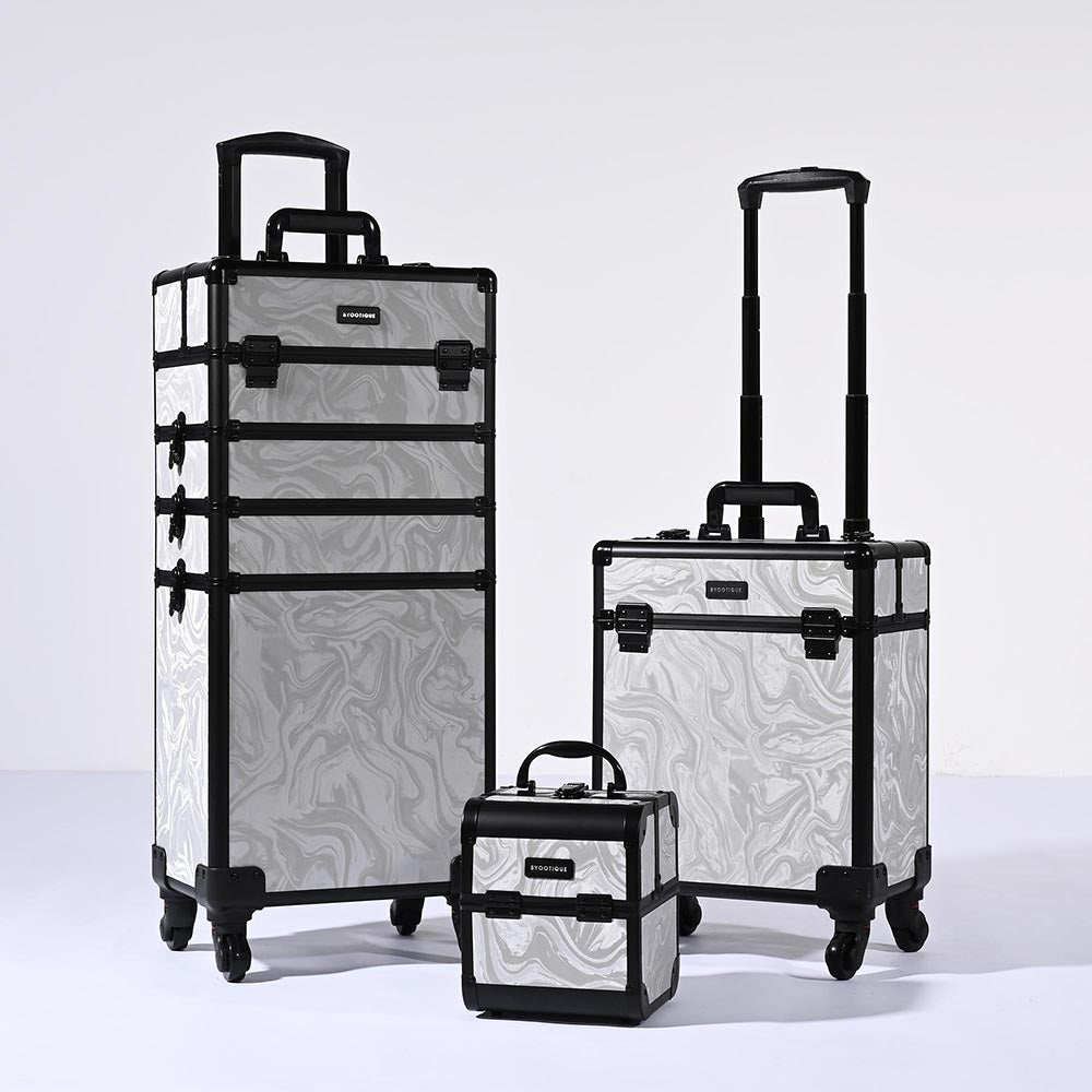 This versatile collection includes an XL 4-in-1 rolling case, a medium-sized rolling case, and a small cube makeup box - everything you need for flawless application on the go. Crafted with a durable ABS body and a high-quality aluminum frame, the cases ensure smooth rolling and ultimate protection for your precious collection.