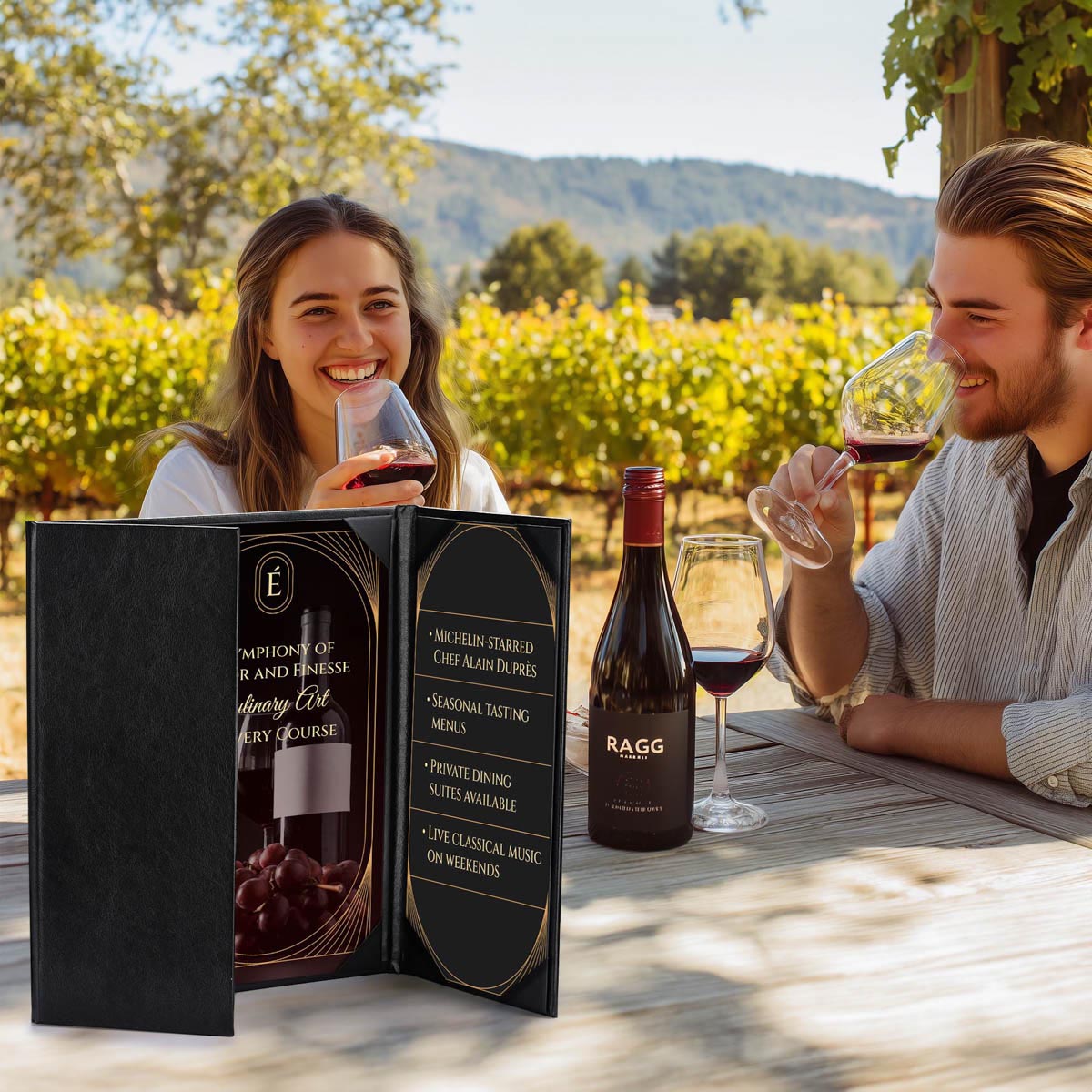 - Accommodates 8 1/2" x 11" menu sheets; Book & Half and Gate-view options also include half pages for wine lists