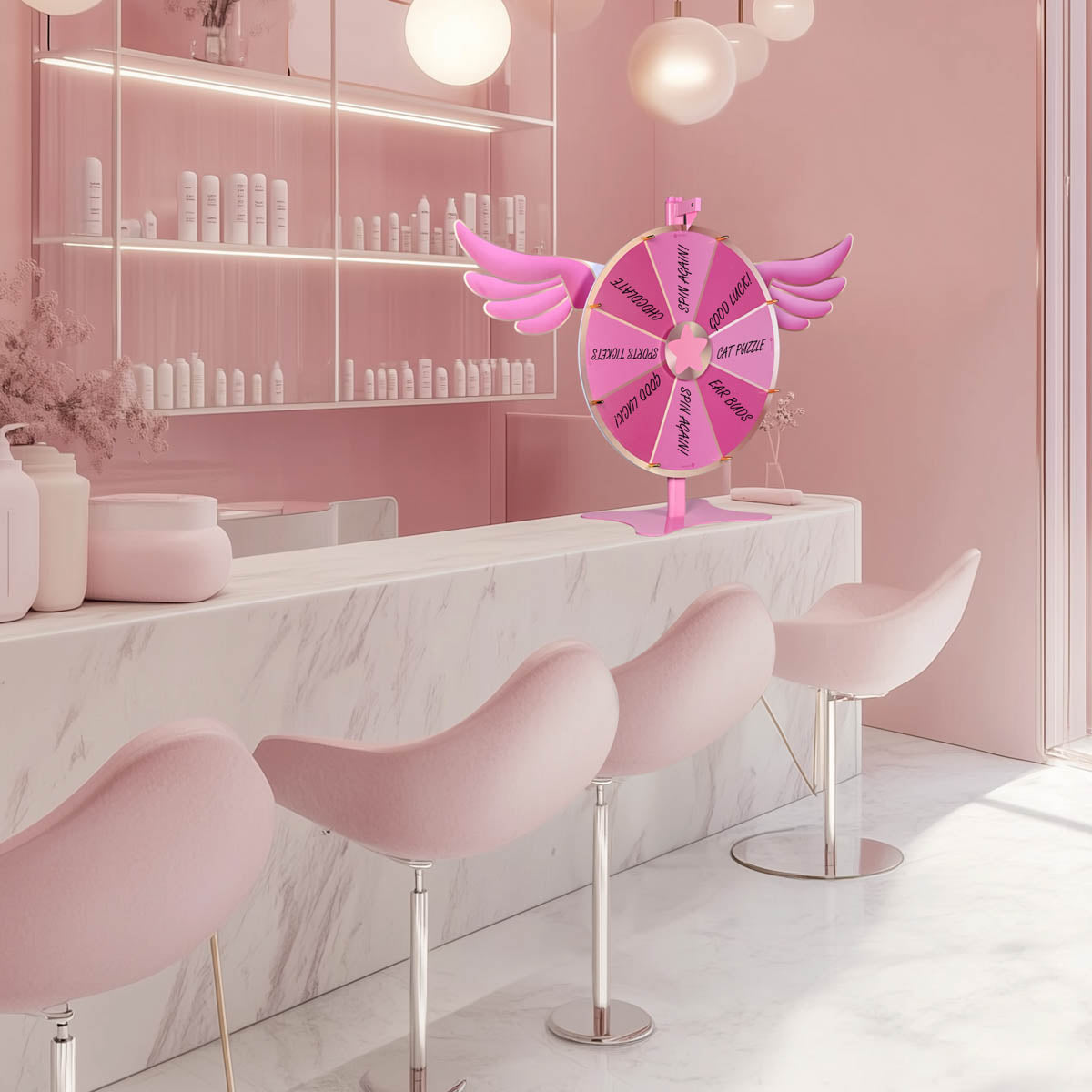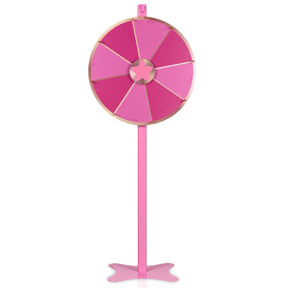 Elevate the atmosphere of any event with the WinSpin Cute Pink Spinning Prize Wheel! Its all-pink look adds a touch of dreaminess while featuring 2 removable poles that you can use on a tabletop or the floor as needed. With 8 customizable slots, this wheel is perfect for parties, carnivals, and shopping malls, making every moment unforgettable!
