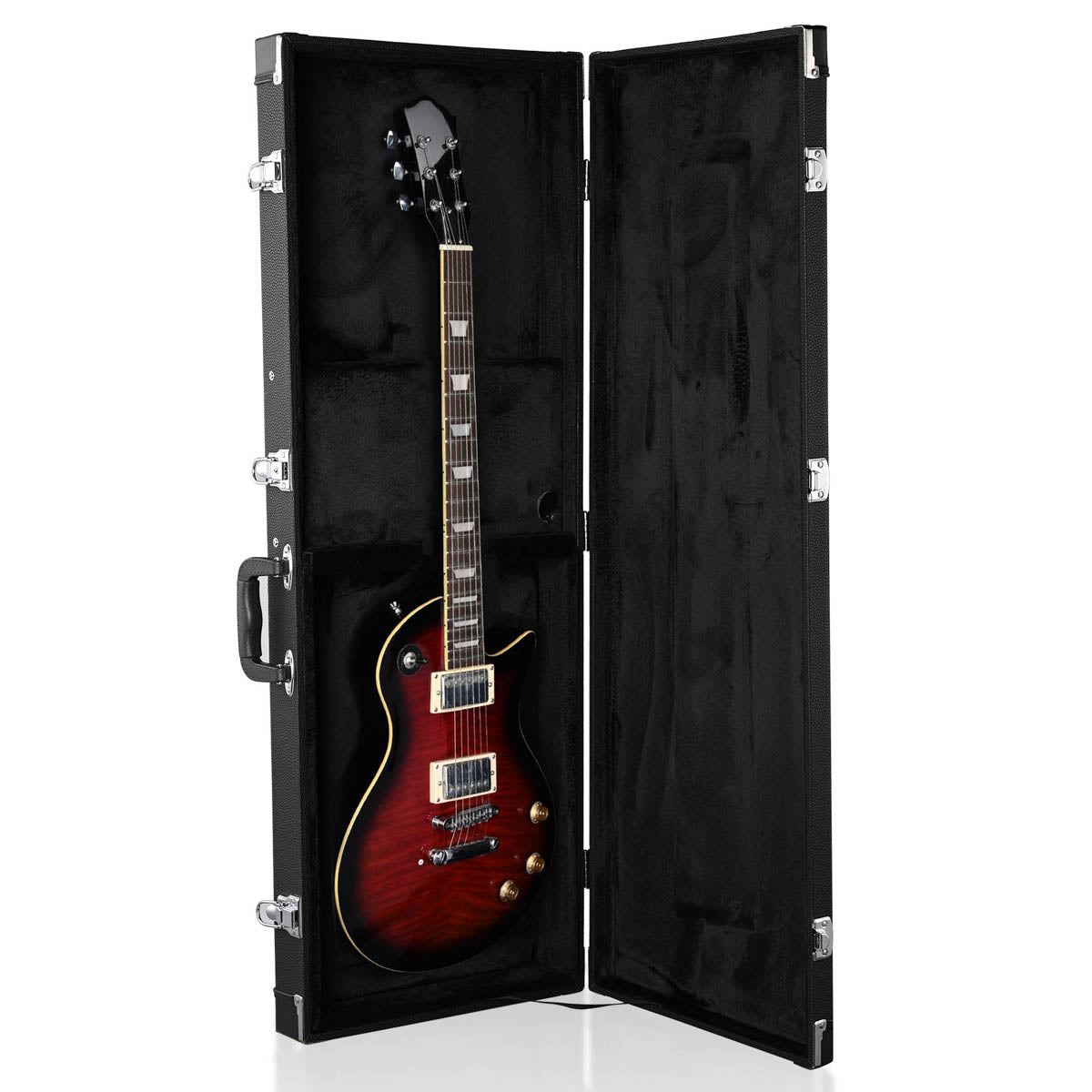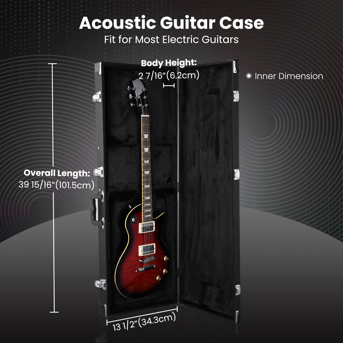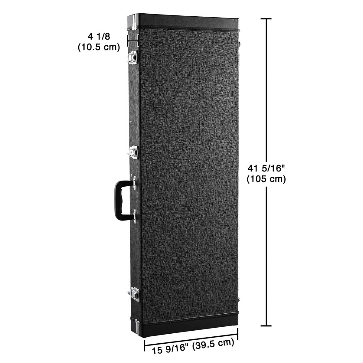 41"L x 15"W Universal Electric Guitar Wood Hardshell Case with Lock fits electric guitars, PU surface for easy cleaning while inner foam padding with soft plush interior for shock absorption. Bumpers on the bottom for added protection and stability.