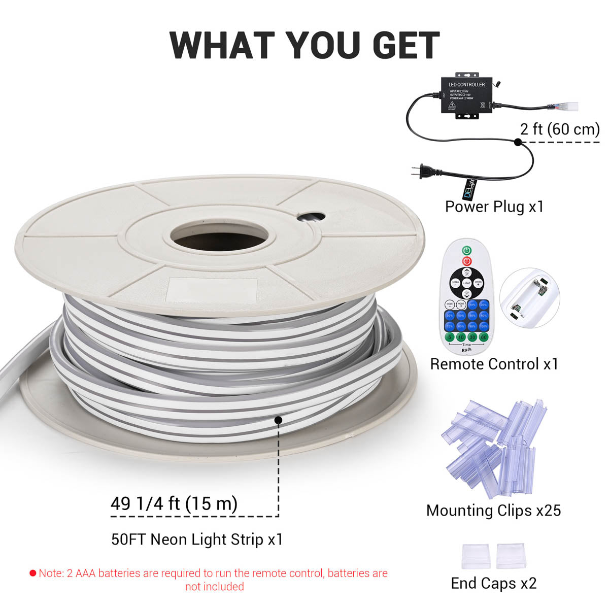 Illuminate any space with lashop 50ft Outdoor Waterproof LED Neon light. Its RF remote offers a 33ft range, providing greater flexibility and coverage. The double-sided and hollow-out lighting effect creates a stunning visual. Easy to install with self-locking zip ties.For full flexibility and a polished finish, pair it with compatible accessories like corner connectors, splice connectors, mounting tracks and controller.