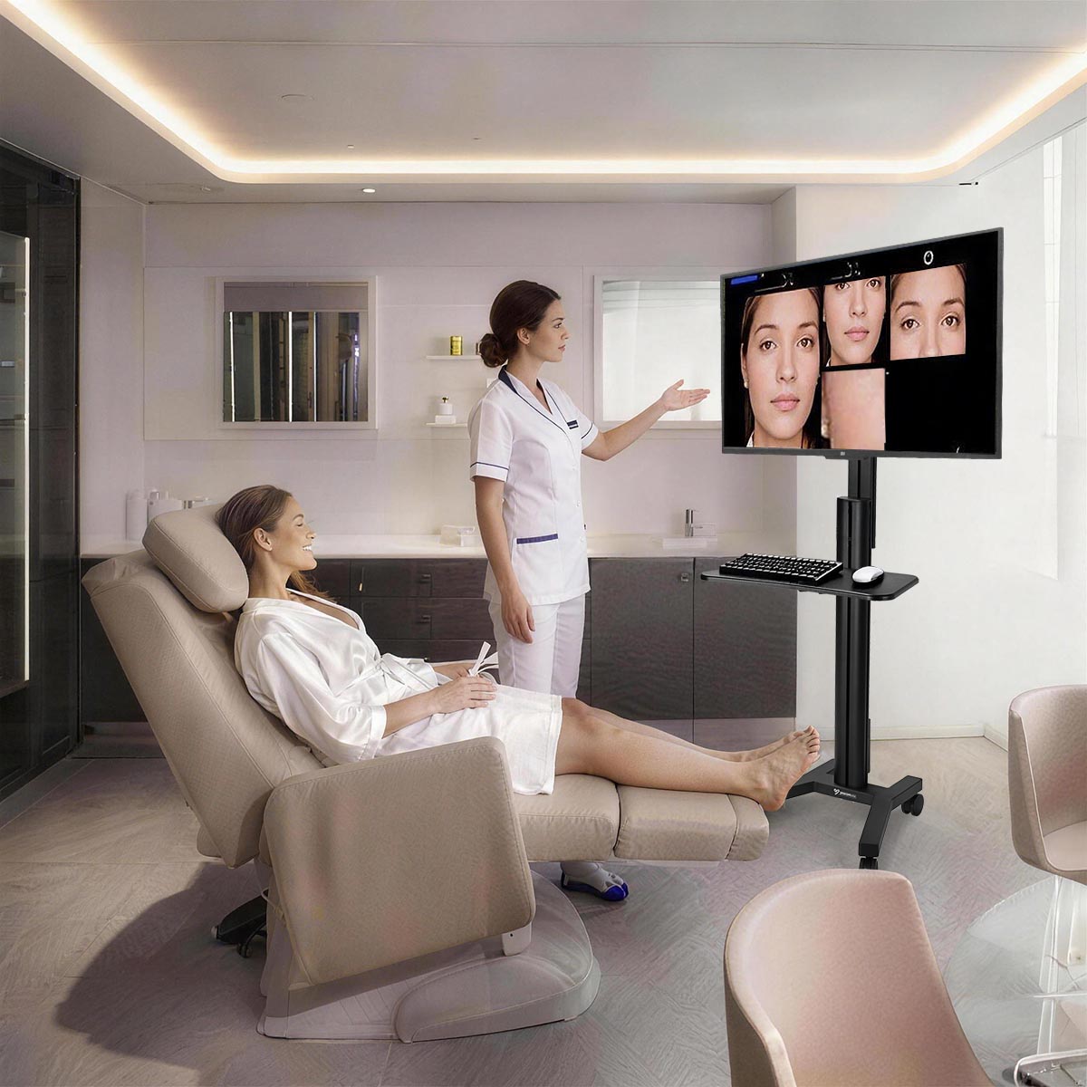 - Integrated cable management and a power strip holder keep wires organized and out of sight for a polished presentation