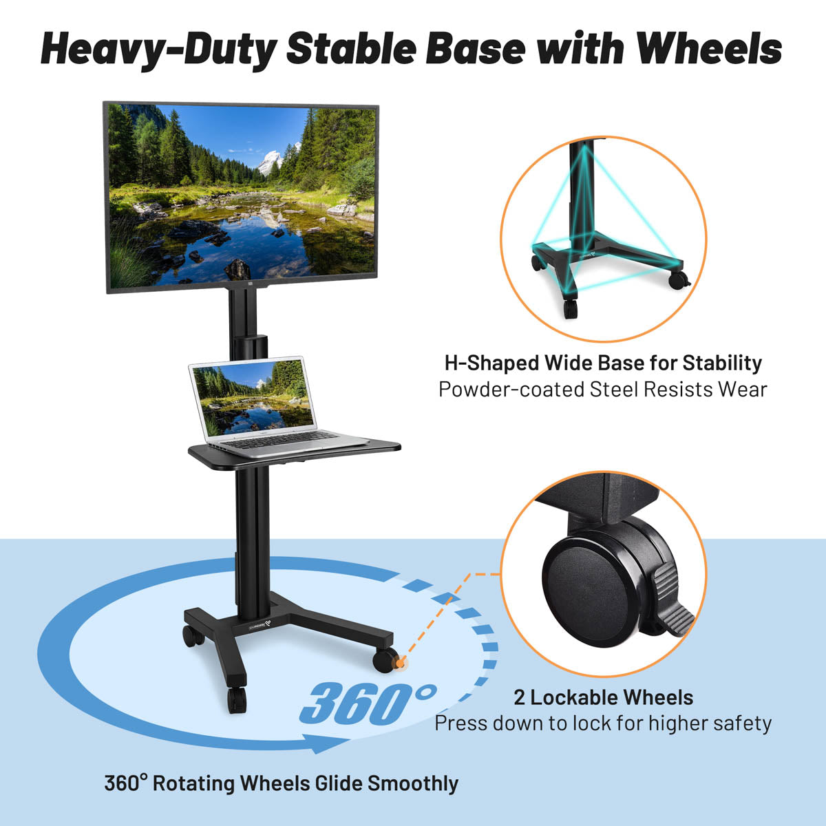 - Extra-wide H-shaped steel base & 2 locking casters prevent tipping, securing your TV and equipment during movement and use