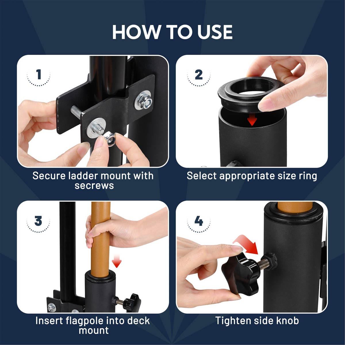 - Hassle-Free Installation - Designed for straightforward setup with all necessary hardware included, just install the ladder mount with the brackets and bolts, insert your flagpole, and finally secure flagpole with screw knob