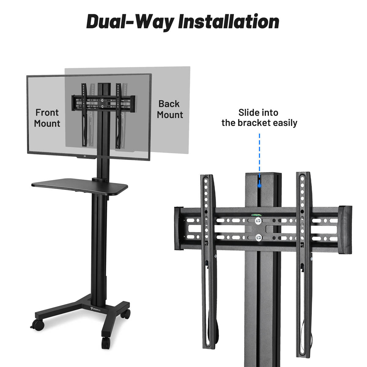 - Setup in Minutes - Get your TV mounted in minutes with the easy-to-follow installation process. Simply attach the mount plate to mobile cart’s pole, secure the brackets to your TV, and click them into place