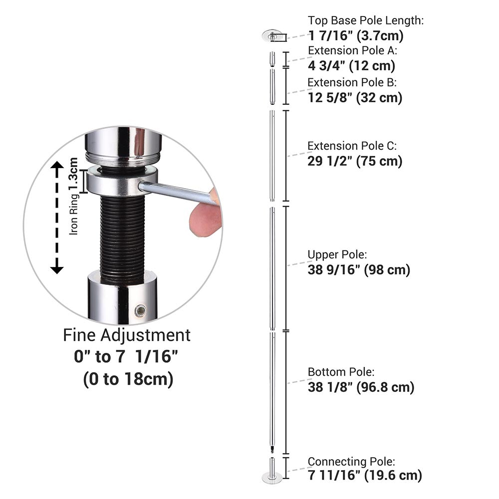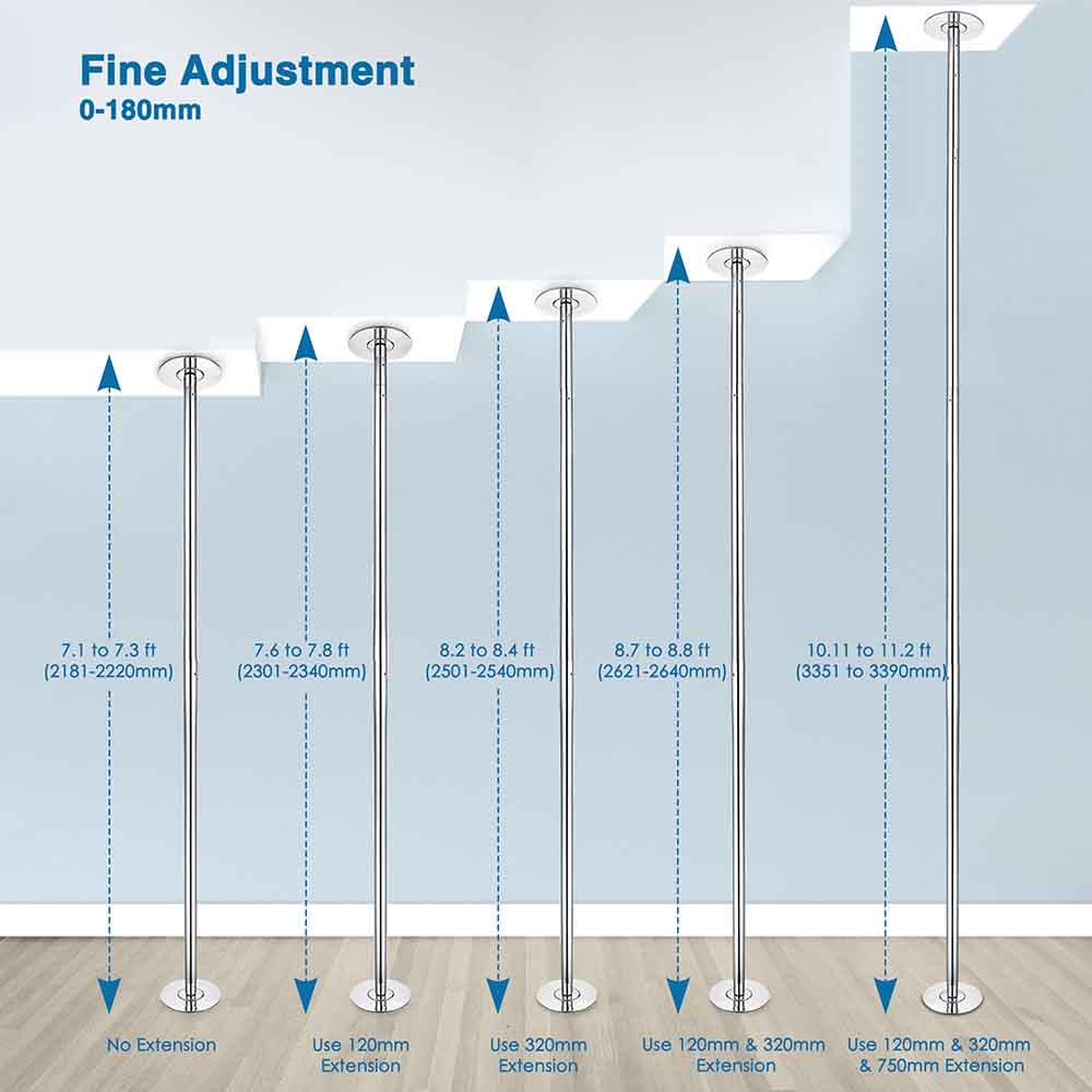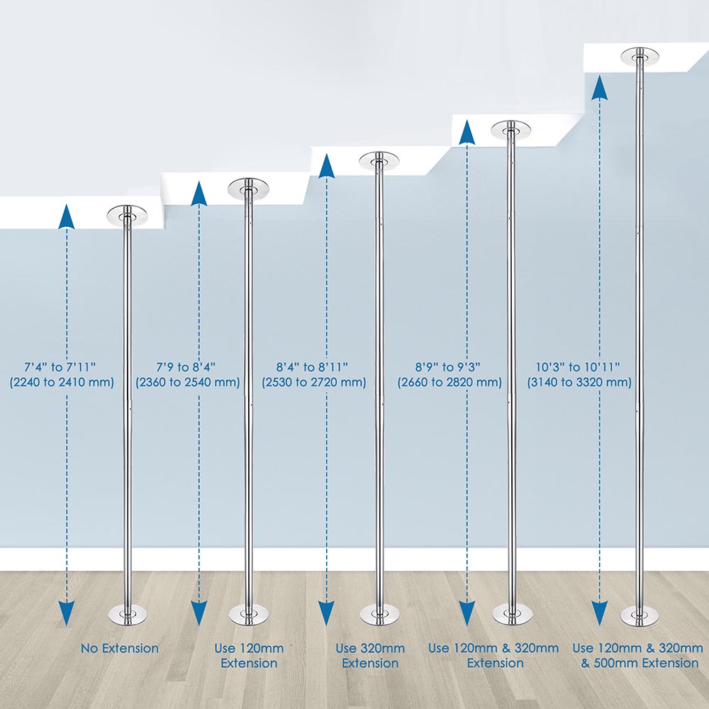 12ft Option: Max. Height: 12'7" (384 cm). Includes 3 Extension Poles. The best for commercial spaces, pole studios & gyms. - (All options adjustable from a minimum height of approx. 7'4")