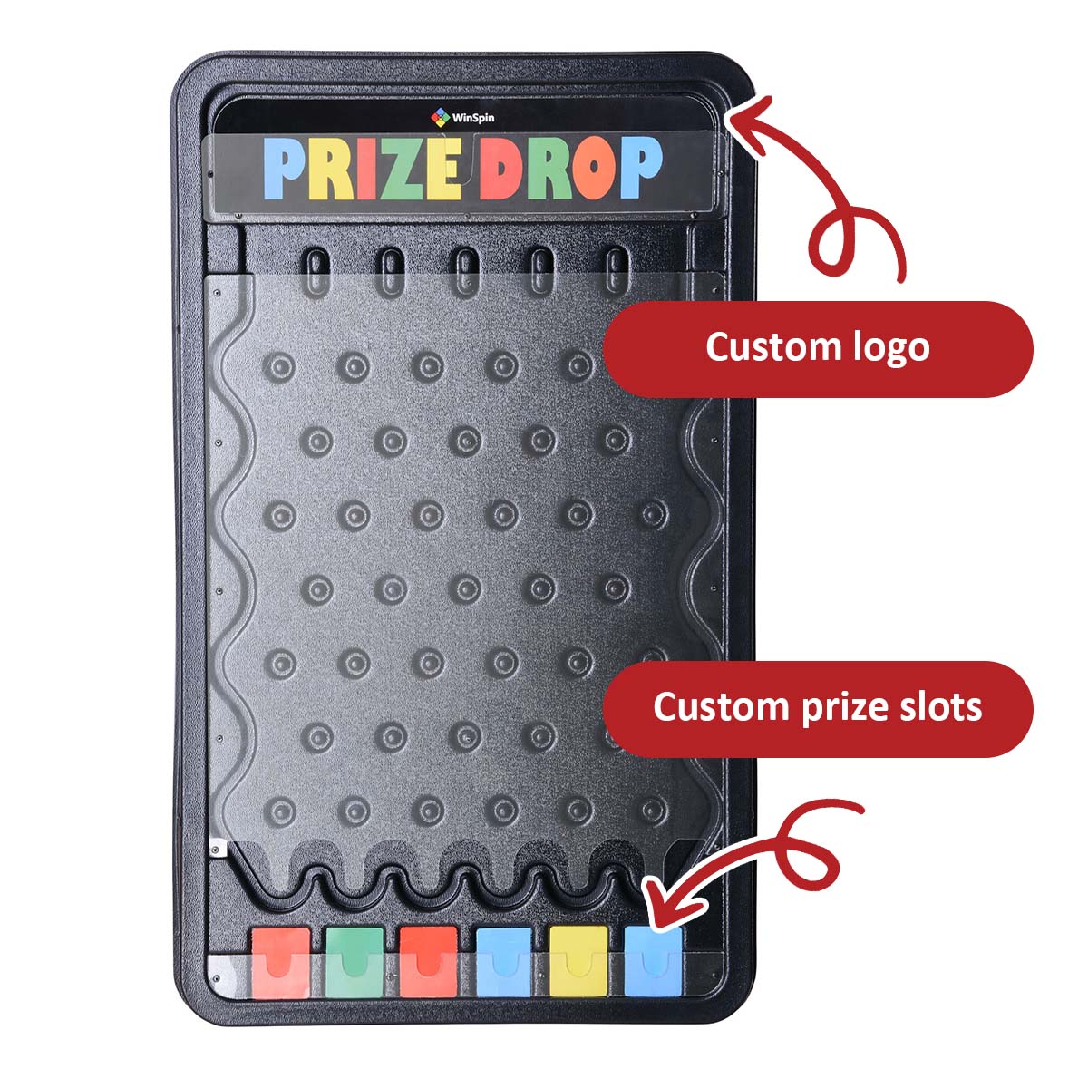 This WinSpin 30"x18" Prize Drop Plinking Board Disk Drop Game with 10 Pucks has a large logo area and 6 prize slots for customizing, perfect for carnival games, holiday activities, parties and more.